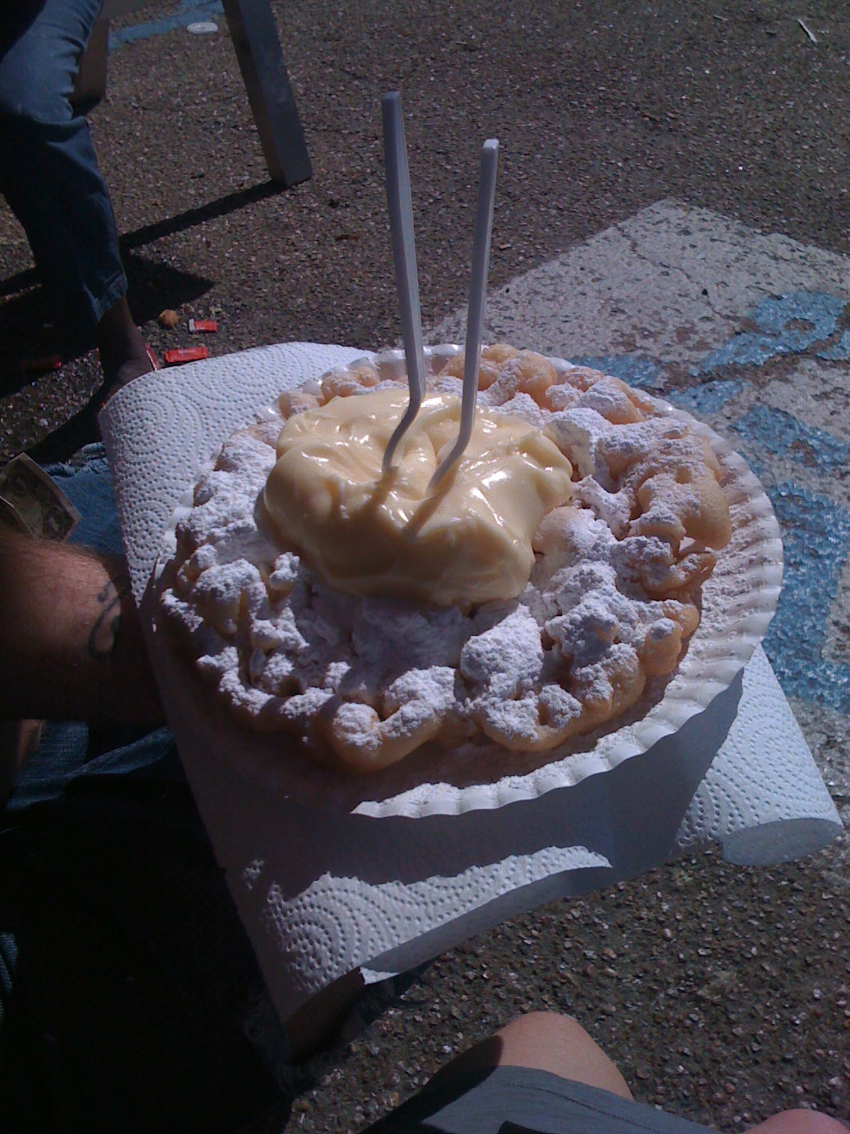 Now, I haven’t really been to any fairs lately, so maybe they’ve been doing this for a while and I was just not aware. But they add TOPPINGS to the funnel cakes. All sorts of toppings. Strawberries, Banana Cream, Milkyway, Reese’s, Cinnamon, Chocolate, Caramel (are you drooling yet?), and Bavarian Cream, which is what we got. It was heaven. Complete glutton heaven. Sadly, we were unable to finish the entire thing. I think we got a little over half way done and realized that we would be fat terrible people if we ate any more. 😉 But to whoever thought of putting Bavarian Cream on a funnel cake, I thank you. You are brilliant.